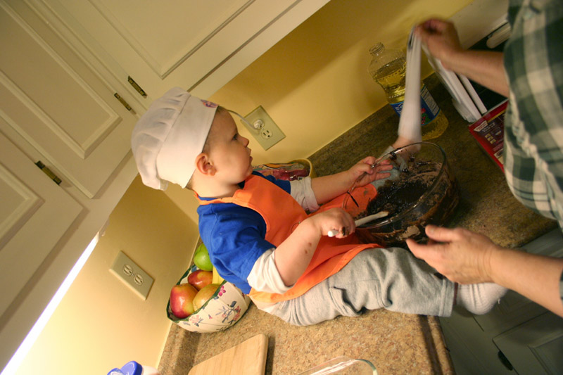 He loves baking brownies. This was about 5 minutes into it. A big blob of chocolate on the left sock.